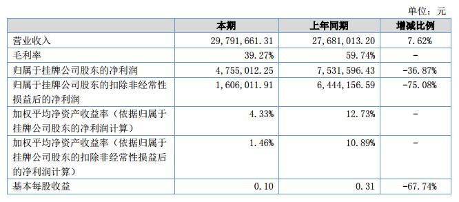 報告期內,公司實現(xiàn)營業(yè)收入29,791,661.31元,,較上年同期增加2,110,648.11元,增幅7.62%;凈利潤為4,755,012.25元,較上年同期減少2,776,584.18元,降幅36.87%。?