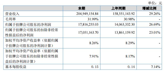 報告期內(nèi),公司實現(xiàn)營業(yè)收入20,495萬元,較上年同期增長了29.26%;營業(yè)成本13,940萬元,較上年同期增長了27.37%;利潤總額2,427萬元,較上年同期增長了26.74%;凈利潤1,782萬元,較上年同期增長了26.69%。?