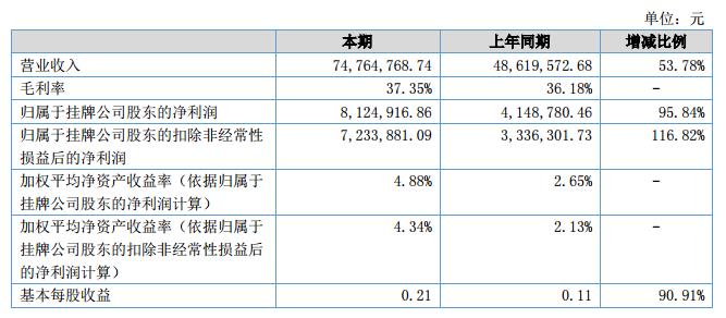 報告期內(nèi)公司實現(xiàn)營業(yè)收入7,476.48萬元,較去年同期增長53.78%;利潤總額和凈利潤分別為883.41萬元和726.10萬元,分別同比增加82.76%和75.89%。?