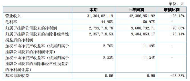 報告期內公司實現(xiàn)營業(yè)收入31,304,021.19元,較上年同期42,386,951.92元下降26.15%;?公司實現(xiàn)凈利潤2,799,718.78元,同比增長-70.86%。