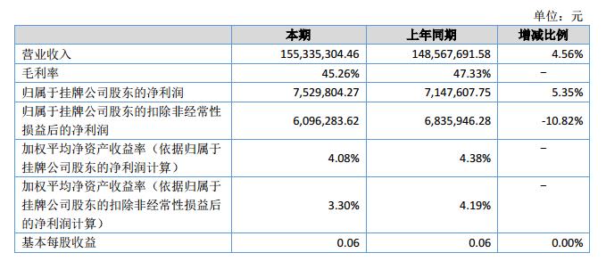 本期實(shí)現(xiàn)營業(yè)收入155,335,304.46元,比去年同期的148,567,691.58元,增長4.56%;實(shí)現(xiàn)營業(yè)成本85,032,596.88元,比上年同期78,253,978.88元,提高8.66%;實(shí)現(xiàn)歸屬于母公司所有者的凈利潤7,529,804.27元,比上年同期7,147,607.75元,增長5.35%。?