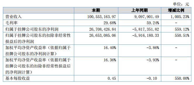 報(bào)告期內(nèi)公司實(shí)現(xiàn)營(yíng)業(yè)收入100,553,163.97元,較上年同期增加了91,455,262.48元,收入比上年同增長(zhǎng)了1,005.23%;營(yíng)業(yè)成本70,704,767.44元,較上年同期增加了66,996,163.72元,成本較上年同期增長(zhǎng)了1,806.51%;公司凈利潤(rùn)26,708,426.84元,較上年同期增加了32,525,778.66元,增長(zhǎng)率為559.12%。