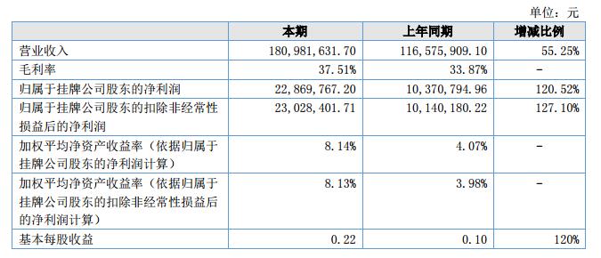 報告期內(nèi),公司實現(xiàn)營業(yè)收入180,981,631.70元,比上年同期116,575,909.10元,增長55.25%;實現(xiàn)凈利潤22,869,767.20元,比上年同期10,373,804.48元,增長120.46%。?