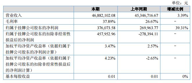 報(bào)告期內(nèi)公司實(shí)現(xiàn)營(yíng)業(yè)收入46,882,102.08元,較上年同期增長(zhǎng)3.39%;稅后凈利潤(rùn)376,073.58元,較上年同期增長(zhǎng)39.31%。?