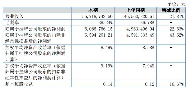 報(bào)告期內(nèi),公司實(shí)現(xiàn)營(yíng)業(yè)收入56,718,742.50元,同比增長(zhǎng)21.81%;營(yíng)業(yè)成本35,029,517.07元,同比增長(zhǎng)19.00%;歸屬于掛牌公司的凈利潤(rùn)6,086,766.15元,同比增長(zhǎng)22.63%。?
