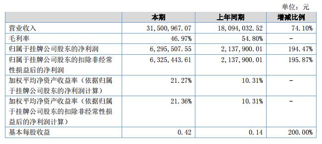 報告期內(nèi)新簽合同7000余萬元,實現(xiàn)營業(yè)收入3,150.10萬元,比去年同期1809.40萬元增長了74.10%,歸屬于掛牌公司股東凈利潤增加424.77萬元,比去年同期增長207.43%。資產(chǎn)總額增長7.36%,負債總額下降20.08%,凈資產(chǎn)增長23.80%。?