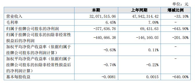 報(bào)告期內(nèi),公司實(shí)現(xiàn)營業(yè)收入3,207.15萬元,同比減少33.10%;毛利率為6.45%,凈利潤-37.76萬元,較上年同期下降643.90%。