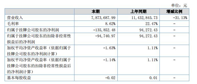 報告期內(nèi)公司營業(yè)收入7,873,687.99元,較去年同期有所下降;營業(yè)成本為7,195,047.18元,與上年同期相比減少1,669,313.02元,降幅18.83%?;凈利潤為-135,852.48元?。