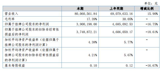 2018年度,公司實(shí)現(xiàn)營業(yè)收入80,060,561.84元,較上年同期增長15.90%;營業(yè)成本66,137,725.04元,較上年同期增長36.87%;銷售毛利率17.39%,較上年同期下降了12.66%;公司凈利潤3,900,198.00元,較上年同期下降16.75%。?