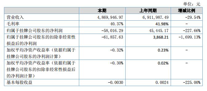 報告期內公司實現(xiàn)營業(yè)收入486.99萬元,同比下降29.54%,營業(yè)成本492萬元,同比下降29%,實現(xiàn)凈利潤-5.8萬元,同比下降228%?。