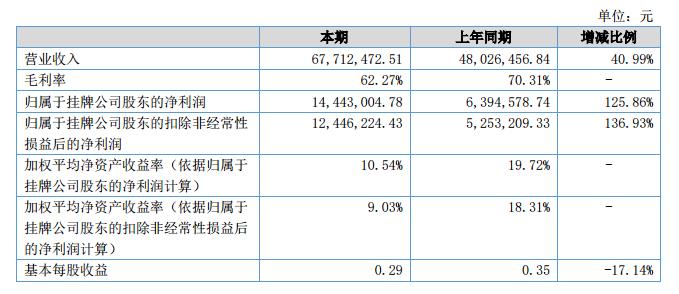 報告期內(nèi),公司實現(xiàn)營業(yè)收入6771.25萬元,較去年同期增長40.99%;告期內(nèi),公司實現(xiàn)歸屬于掛牌公司的凈利潤1444.30萬元,較去年同期增長125.86%。