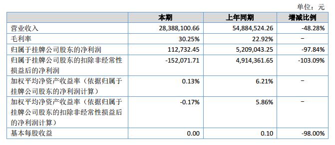 報告期內(nèi),公司實(shí)現(xiàn)營業(yè)收入2,838.81萬元,較上年同期下降48.28%;利潤總額為17.75萬元,較上年同期下降97.14%;歸屬于掛牌公司股東的凈利潤為11.27萬元,較上年同期下降97.84%。