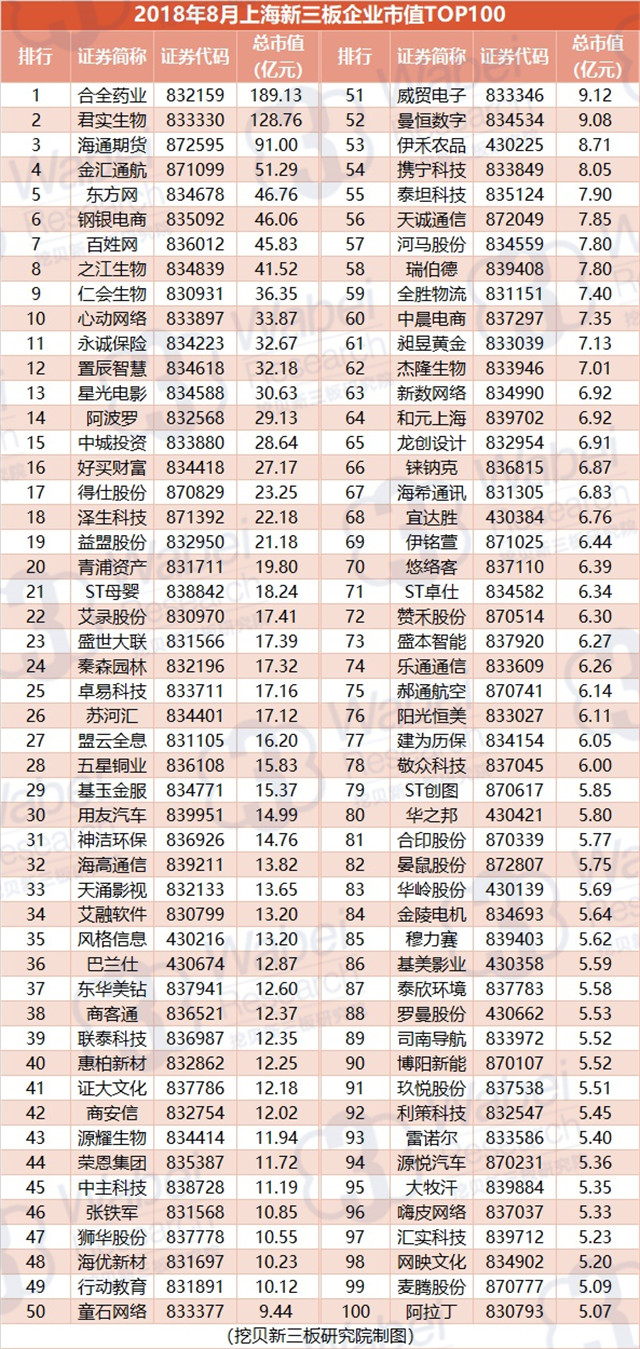 附:2018年8月上海新三板企業(yè)市值TOP100