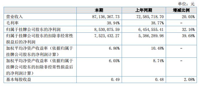報告期內(nèi),公司實現(xiàn)營業(yè)收入87,136,367.73元,較上年同期增長14,550,649.03元,增長比例20.05%;?凈利潤8,530,075.59元,同比增長32.16%。