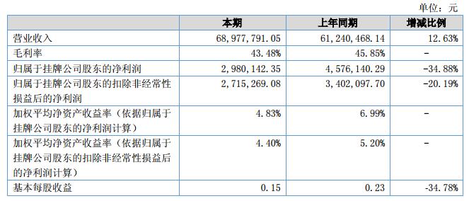 報告期內(nèi),公司實現(xiàn)營業(yè)總收入68,977,791.05元,比上年同期增長7,737,322.91元,增長比例為12.63%;實現(xiàn)凈利潤2,899,276.98元,較上年同期降低976,225.49元,降低比例為25.19%。?