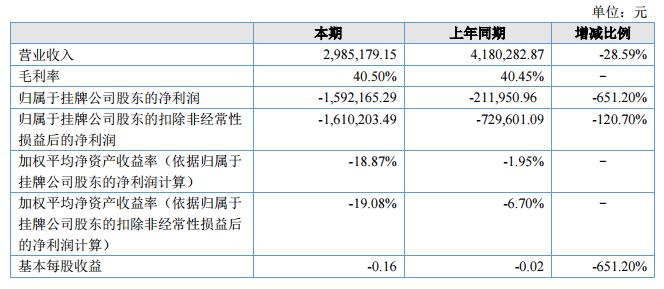 報告期內(nèi)公司營業(yè)收入為2,985,179.15元,同比下降28.59%;凈利潤-1,592,165.29元,同比下降651.20%。