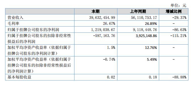 報(bào)告期內(nèi)公司實(shí)現(xiàn)營業(yè)收入3,963.24萬元,比去年同期減少了1,647.83萬元,同比下降29.37%;凈利潤1,219,038.67萬元,較去年同期減少了789.94元,同比下降86.63%。