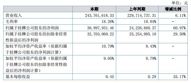 報(bào)告期內(nèi)公司實(shí)現(xiàn)營業(yè)收入24,3761,618.33元,較2017年同期實(shí)現(xiàn)的229,714,737.31元,增長6.11%;營業(yè)成本199,259,988.18元,較2017年同期的188,266,406.72元,增長5.84%;實(shí)現(xiàn)凈利潤38,997,931.46元,較2017年同期的24,226,668.37元,增加60.97%。