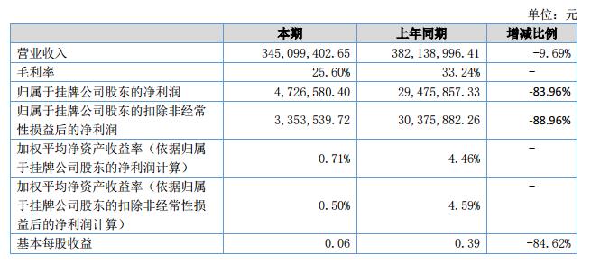 報(bào)告期內(nèi)公司實(shí)現(xiàn)營(yíng)業(yè)收入34,509.94萬(wàn)元,同比下降9.69%;利潤(rùn)總額和凈利潤(rùn)分別為366.01萬(wàn)元和477.74萬(wàn)元,同比分別下降88.94%和83.75%。