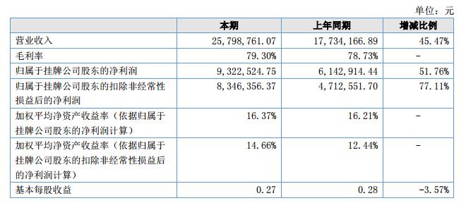 報告期內(nèi),實現(xiàn)營業(yè)收入25,798,761.07元,與上年同比增長8,064,594.18元,比上年同期上升45.47%;利潤總額10,779,033.37元,與上年同比增長3,781,307.05元,比上年同期上升54.04%;實現(xiàn)歸屬于掛牌公司股東凈利潤9,322,524.75元,比上年同比增長3,179,610.31元,比上年同期上升51.76%。?