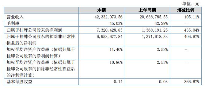 報告期內(nèi),公司營業(yè)收入為42,332,073.56元,比上年同期的20,638,785.55元增加了105.11%,營業(yè)成本為23,271,797.73元,比上年同期的11,910,131.40元增加了95.39%,凈利潤為7,280,040.27元,比上年同期的1,229,575.13增加了492.08%。?