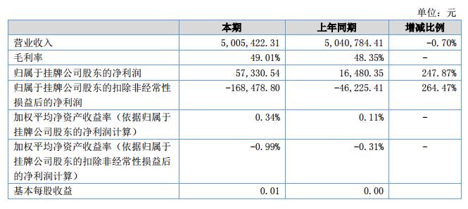 報告期內,公司實現(xiàn)營業(yè)收入5,005,422.31元,與上年同期基本持平;利潤總額為152,994.08元,凈利潤為57,330.54元,較上年同期均有增長。?