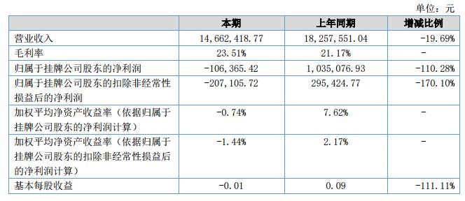 報(bào)告期內(nèi)公司實(shí)現(xiàn)銷(xiāo)售收入1,466.24萬(wàn)元,較上年同期減少19.69%;凈利潤(rùn)-10.64萬(wàn)元,同比減少110.28%。
