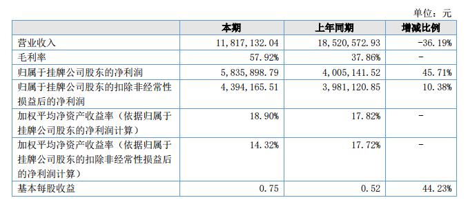 報(bào)告期內(nèi)公司實(shí)現(xiàn)營業(yè)收入1,181.71萬元,較上年同期減少36.19%;報(bào)告期內(nèi)凈利潤為583.59萬元,比上年同期增長了45.71%。