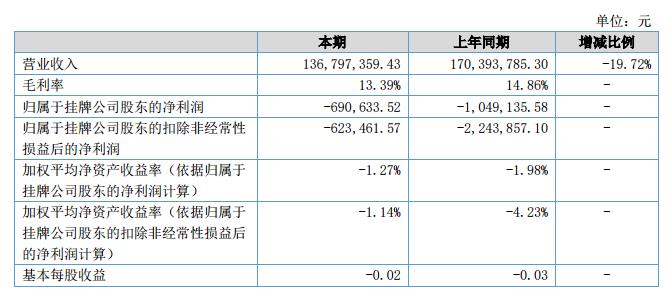 報告期內(nèi)公司實現(xiàn)營業(yè)收入1.37億,較上年同期1.70億減少3,360萬,同比下降19.72%;報告期實現(xiàn)凈利潤-68萬,較上年同期-104萬減少虧損36萬。?