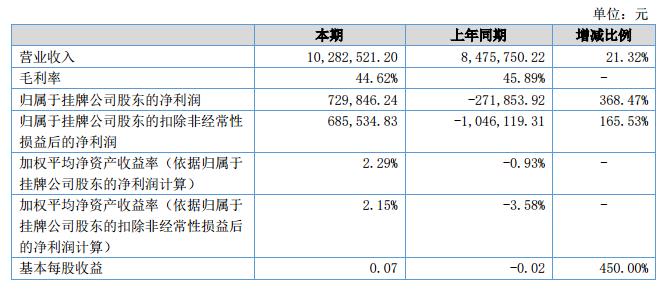報(bào)告期內(nèi)實(shí)現(xiàn)營業(yè)收入10,282,521.20元,較上年同期增長21.32%;實(shí)現(xiàn)營業(yè)凈利潤為729,846.24元,較上年同期增長368.47%。