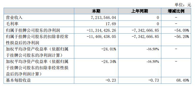 報(bào)告期內(nèi),公司2018年上半年實(shí)現(xiàn)營業(yè)收入7,213,546.04元,歸屬于母公司的凈利潤為-11,314,426.26元,比上年同期增長-54.09%。?