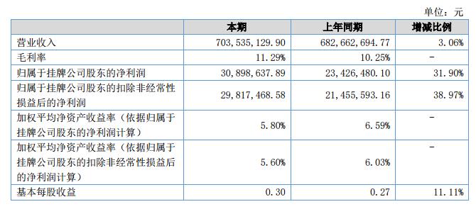 報(bào)告期內(nèi),公司實(shí)現(xiàn)營業(yè)收入703,535,129.90元,與去年同期相比增長3.06%;營業(yè)成本624,115,469.39元,與去年同期相比增長1.87%;實(shí)現(xiàn)歸屬于母公司股東的凈利潤30,898,637.89元,與去年同期相比增長31.90%。?