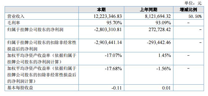 報(bào)告期內(nèi)公司實(shí)現(xiàn)營業(yè)收入12,223,346.83元,比上年同期增加4,101,652.51元,同比增長50.50%;凈利潤-2,803,310.81元?。