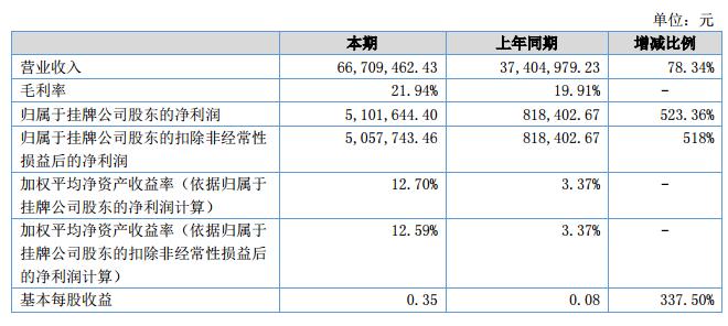 報告期內(nèi)公司實現(xiàn)營業(yè)收入6670.95萬元,比上年同期增加2930.45萬元,增長率達(dá)78.34%;報告期內(nèi)實現(xiàn)凈利潤510.16萬元,比上年同期增加428.32萬元,增長率523.36%。?
