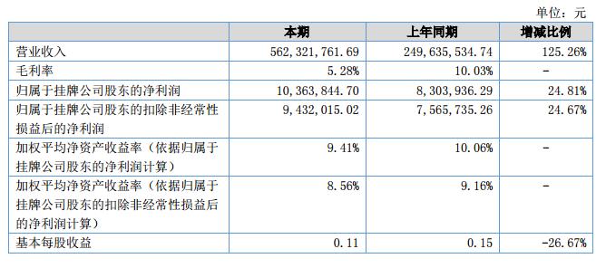 報(bào)告期內(nèi)公司實(shí)現(xiàn)營(yíng)業(yè)收入5.62億元,較上年同期同比增長(zhǎng)125.26%;公司實(shí)現(xiàn)凈利潤(rùn)1036.38萬元,較上年同期同比增長(zhǎng)24.81%。?