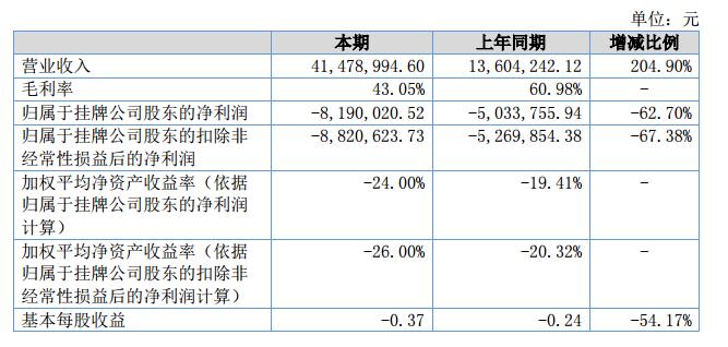 報(bào)告期內(nèi)公司主營業(yè)務(wù)收入為41,478,994.60元,較上年同期13,604,242.12元同比增長204.90%;凈利潤-8,190,020.52元,同比增長-62.70%。