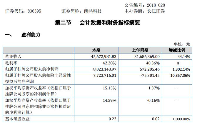 挖貝網(wǎng)訊 9月8日消息,朗鴻科技(證券代碼:836395)近日公布的2018年半年報(bào)顯示,截至2018年6月30日,企業(yè)實(shí)現(xiàn)營收4567.3萬元;歸屬于掛牌公司股東的凈利潤為802萬元。