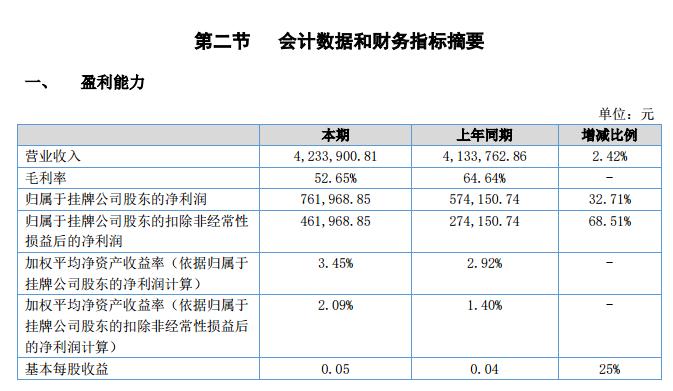 1、經(jīng)營(yíng)業(yè)績(jī)公司 2018 年上半年實(shí)現(xiàn)營(yíng)業(yè)收入 4,233,900.81 元,較上年同期增長(zhǎng) 2.42%,實(shí)現(xiàn)歸屬于掛牌公司股東的凈利潤(rùn) 761,968.85 元。公司經(jīng)營(yíng)活動(dòng)產(chǎn)生的現(xiàn)金流量?jī)纛~為 739,270.18 元,較去年同期增長(zhǎng)了 173.71%,主要是因?yàn)楣句N(xiāo)售回款情況比較理想、應(yīng)收票據(jù)及應(yīng)收賬款未大幅增長(zhǎng),使公司銷(xiāo)售商品提供勞務(wù)收到的現(xiàn)金較去年同期大幅增加所致。公司資產(chǎn)總額為 27,328,580.01 元,較期初總資產(chǎn)增長(zhǎng) 1.56%,公司負(fù)債總額為 4,861,301.67 元,較期初下降 6.56%,資產(chǎn)負(fù)債規(guī)模變動(dòng)不大。公司凈資產(chǎn)為 22,467,278.34 元,較上年同期 21,705,309.49 元凈增加 761,968.85 元,一方面是由于公司成功掛牌中介服務(wù)費(fèi)降低、另一方面是因?yàn)楣炯訌?qiáng)費(fèi)用控制辦公費(fèi)及會(huì)務(wù)費(fèi)下降,從而使管理費(fèi)用大幅下降所致。