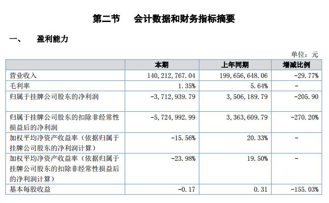 2、報告期內(nèi),歸屬于母公司的凈利潤為-3,712,939.79 元,毛利潤為 1,891,966.97 元,毛利率為 1.35%,主要原因為毛利率為 1.54%的運(yùn)輸服務(wù)業(yè)務(wù)占總收入的 99.63%。