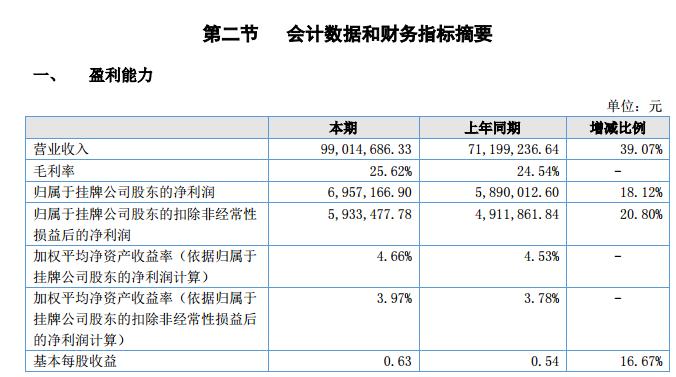 上半年,公司總資產(chǎn)為28,225.89萬元,比上期期末增加 14.38%。應收票據(jù)及應收賬款為7,923.88 萬元,比上期期末增加 5.96%,主要系報告期內(nèi)公司營業(yè)收入 9,901.47 萬元,較去年同期增加 39.07%;公司總負債為為 12,946.67 萬元,較上期期末增加 28.65%.短期借款為 4,100 萬元,比上期期末增長 78.47%,主要系公司擴大生產(chǎn)規(guī)模,設備投入需求增加。歸屬于掛牌公司股東的凈利潤 695.72 萬元較上年增長 18.12%。經(jīng)營活動凈現(xiàn)金流量為 751.26 萬元,與上年同期相比減少 1,037.07 萬元。