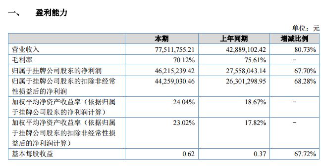 上半年,公司總資產(chǎn) 235,241,991.31 元,較上年同期增長 24.26%;歸屬于掛牌公司股東的凈資產(chǎn) 170,559,182.07 元,較上年同期增長 0.96%;報(bào)告期內(nèi),共實(shí)現(xiàn)營業(yè)收入 77,511,755.21 元,較上年同期增長 80.73%,歸屬于掛牌公司股東的凈利潤 46,215,239.42 元,較上年同期增長 67.70%;經(jīng)營活動(dòng)產(chǎn)生的現(xiàn)金流量?jī)纛~為 43,231,765.87 元,較上年同期增長 100.20%。2018 年上半年,公司營收、利潤和資產(chǎn)規(guī)模均實(shí)現(xiàn)大幅增長,取得了良好的經(jīng)營業(yè)績(jī),這主要得益于 2017 年度公司在全國范圍內(nèi)加大業(yè)務(wù)布局力度,銷售人員和項(xiàng)目操作人員數(shù)量均大幅增長,客戶數(shù)量進(jìn)一步增加,在手訂單量充足,公司品牌影響力和市場(chǎng)口碑進(jìn)一步提升,這為 2018 年上半年公司的業(yè)績(jī)爆發(fā)打下了良好基礎(chǔ)。
