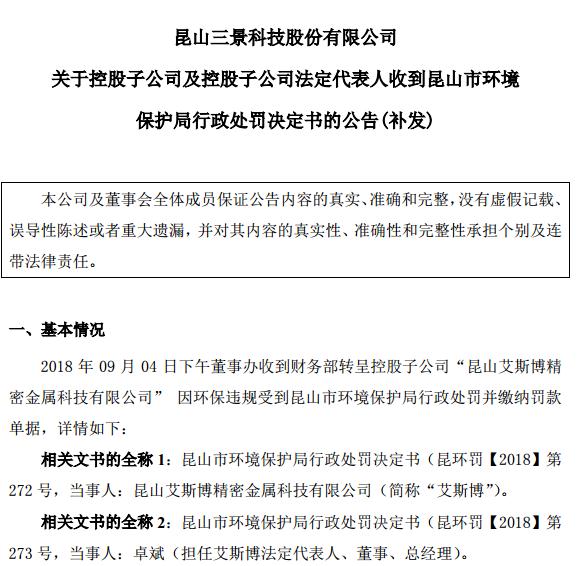 挖貝網(wǎng) 9月10日消息,新三板掛牌企業(yè)三景科技(430393) 子公司艾斯博未通過環(huán)保“三同時”驗收開工生產(chǎn),艾斯博和法人代表卓斌被昆山市環(huán)境保護(hù)局處罰。