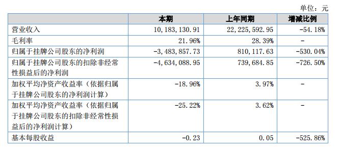 報告期內公司實現(xiàn)營業(yè)收入10,183,130.91元,比上年同期下降了54.18%;營業(yè)成本7,947,150.32元,同比上年同期下降了50.07%;凈利潤為-3,483,857.73元,同比上年同期下降了530.04%。?