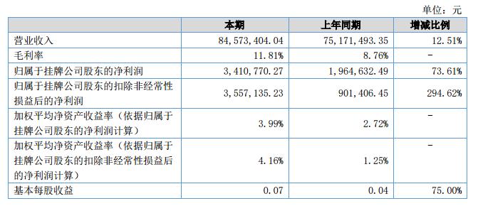 報告期內(nèi)營業(yè)收入84,573,404.04元,較去年同期增加12.51%;營業(yè)成本74,585,035.19元,較去年同期增加8.74%;凈利潤3,410,770.27元,較去年同期增加73.61%。?