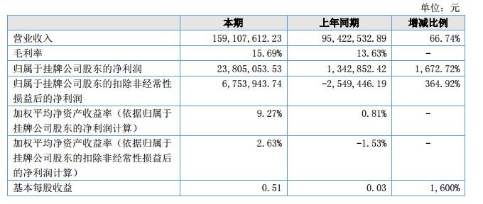 報(bào)告期內(nèi)公司實(shí)現(xiàn)營(yíng)業(yè)收入15,910.76萬(wàn)元,比上年同期增長(zhǎng)了66.74%。實(shí)現(xiàn)凈利潤(rùn)2,380.51萬(wàn)元,較去年同期增長(zhǎng)了1,672.72%。?