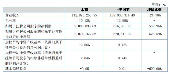 公司在報告期內(nèi)的營業(yè)收入為142,873,253.55元,比去年同期降低了24.78%。營業(yè)成本為128,409,994.16元,比去年同期降低了22.30%。歸屬于母公司所有者的凈利潤為-2,889,033.63元,比去年同期增虧3,545,695.53元。?