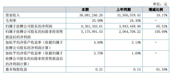 報(bào)告期內(nèi),公司實(shí)現(xiàn)營業(yè)收入3,808.12萬元,較上年同期增加612.47萬元,增長比例19.17%;發(fā)生營業(yè)總成本3,177.67萬元,較上年同期增加211.39萬元,增長比例為7.13%;實(shí)現(xiàn)凈利潤668.90萬元,較上年同期增加了92.91%。?