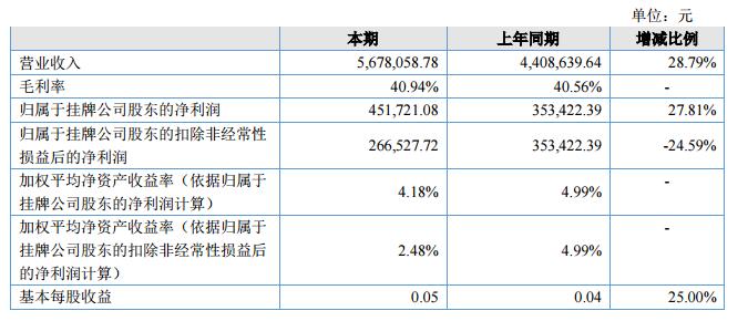 報(bào)告期內(nèi)公司實(shí)現(xiàn)營(yíng)業(yè)收入567.81萬(wàn)元,比上年同期增長(zhǎng)28.79%;報(bào)告期實(shí)現(xiàn)歸屬于掛牌公司股東的凈利潤(rùn)為45.17萬(wàn)元,比上年同期降低10.93%。?