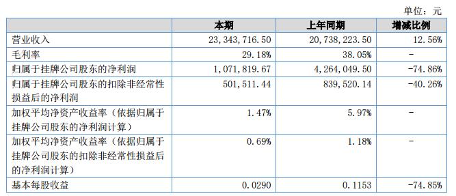 報(bào)告期內(nèi),公司實(shí)現(xiàn)營(yíng)業(yè)收入2,334.37萬(wàn)元,較上年同期2,073.82萬(wàn)元增加12.56%;公司實(shí)現(xiàn)凈利潤(rùn)107.18萬(wàn)元,較上年同期426.40萬(wàn)元下降74.86%。?