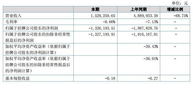 報(bào)告期內(nèi),公司營(yíng)業(yè)收入為152.83萬元,同比上期下降了68.75%;報(bào)告期公司凈利潤(rùn)為-132.62萬元,同比上期減少虧損33.28%。?